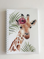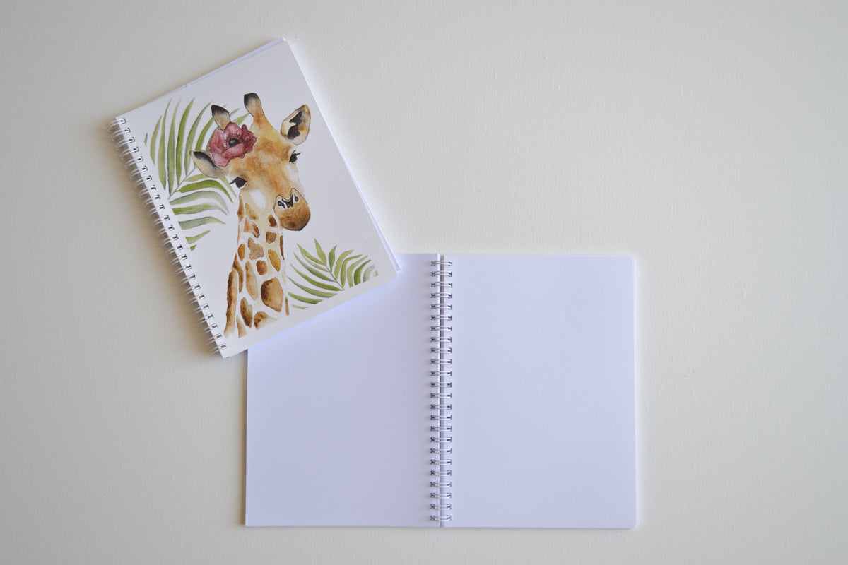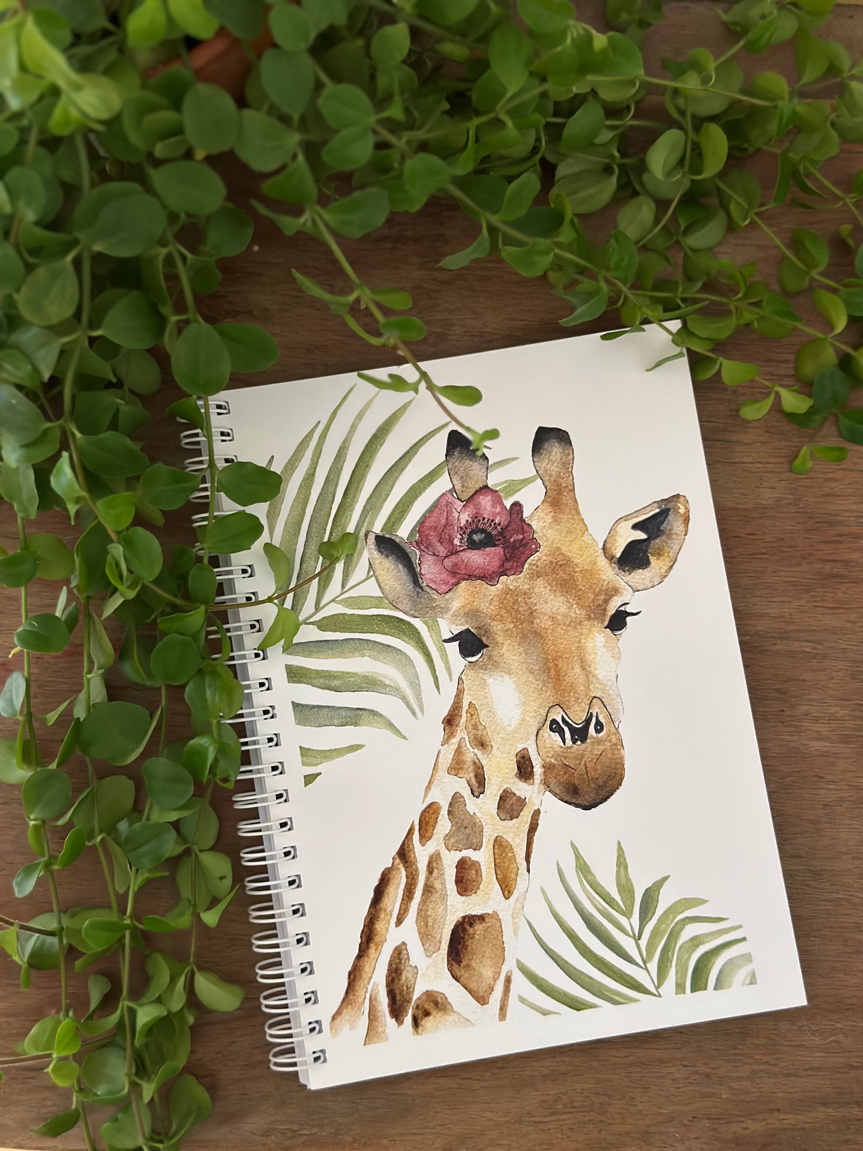 Laissez parler votre créativité avec les carnets à spirales illustrés d'une aquarelle d'une girafe avec une fleur. Chaque carnet est une invitation à rêver, dessiner, écrire ou noter vos pensées du quotidien.